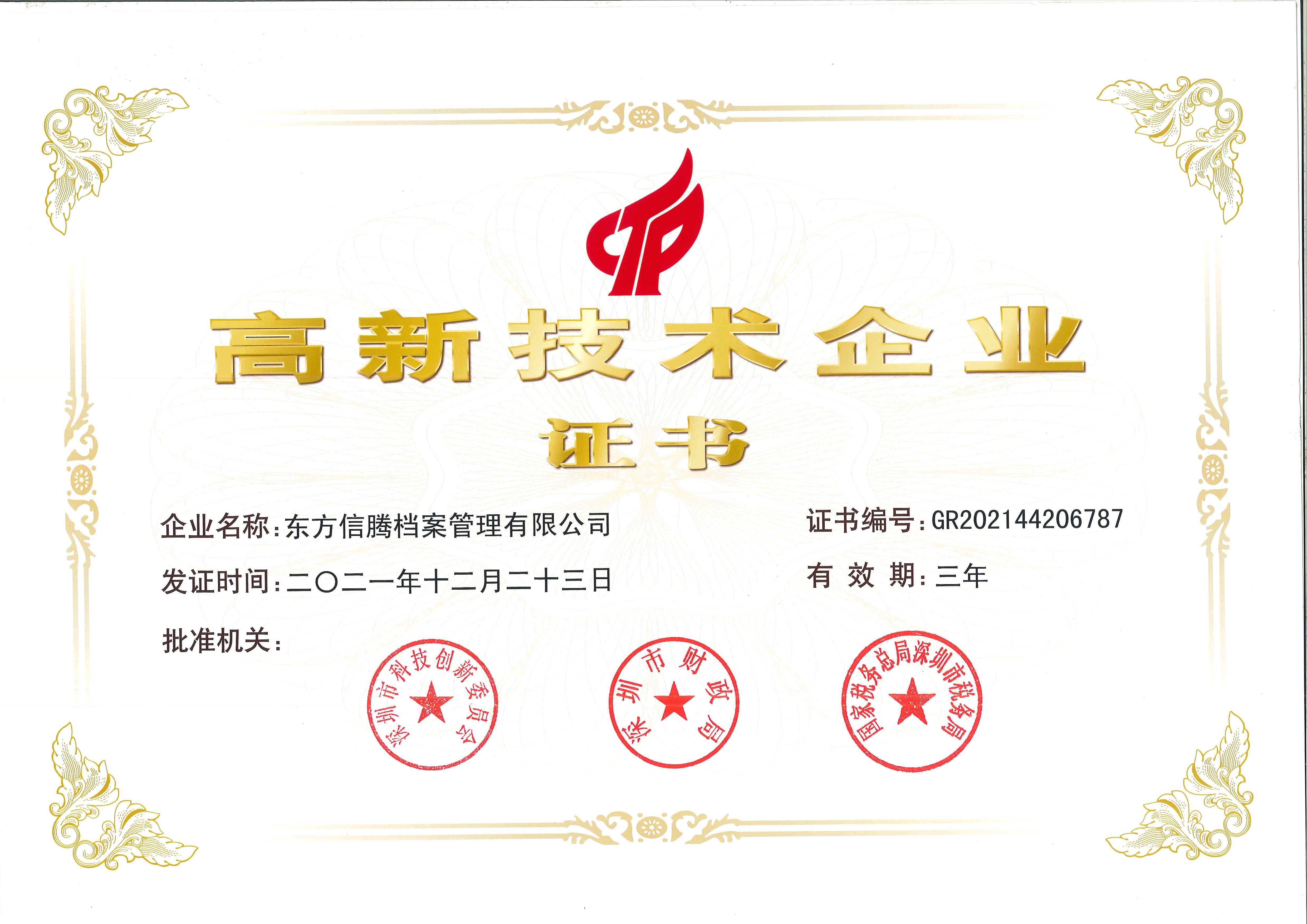 • 国家高新技术证书