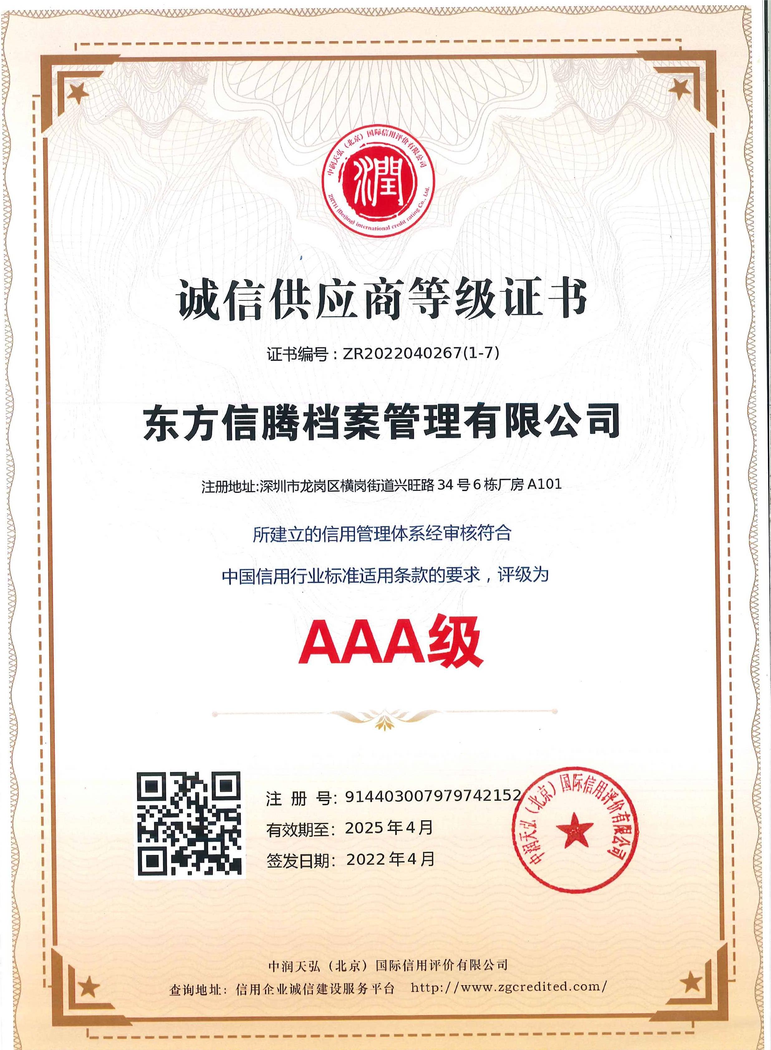• AAA级资信等级证书