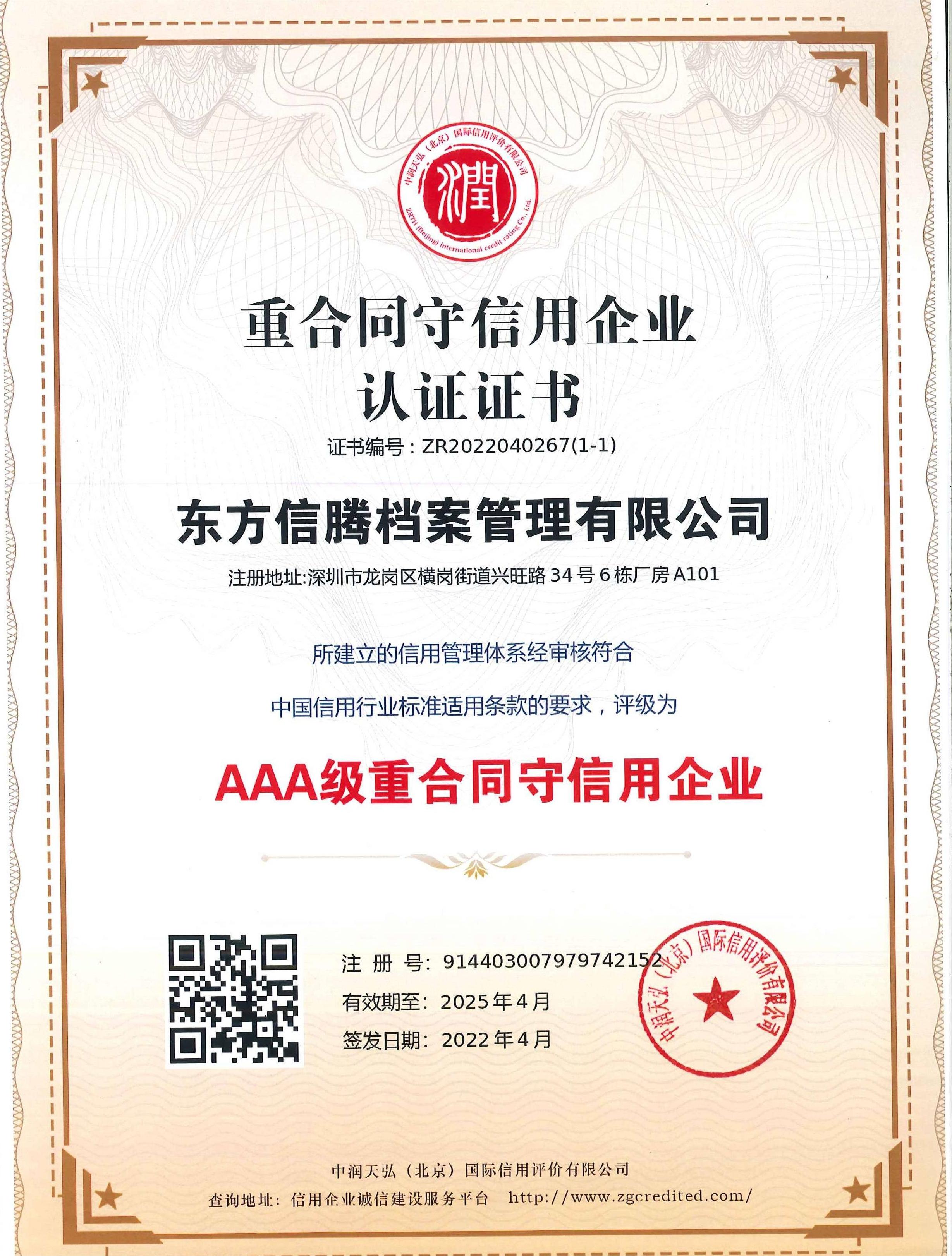 AAA级重合同守信用企业认证证书